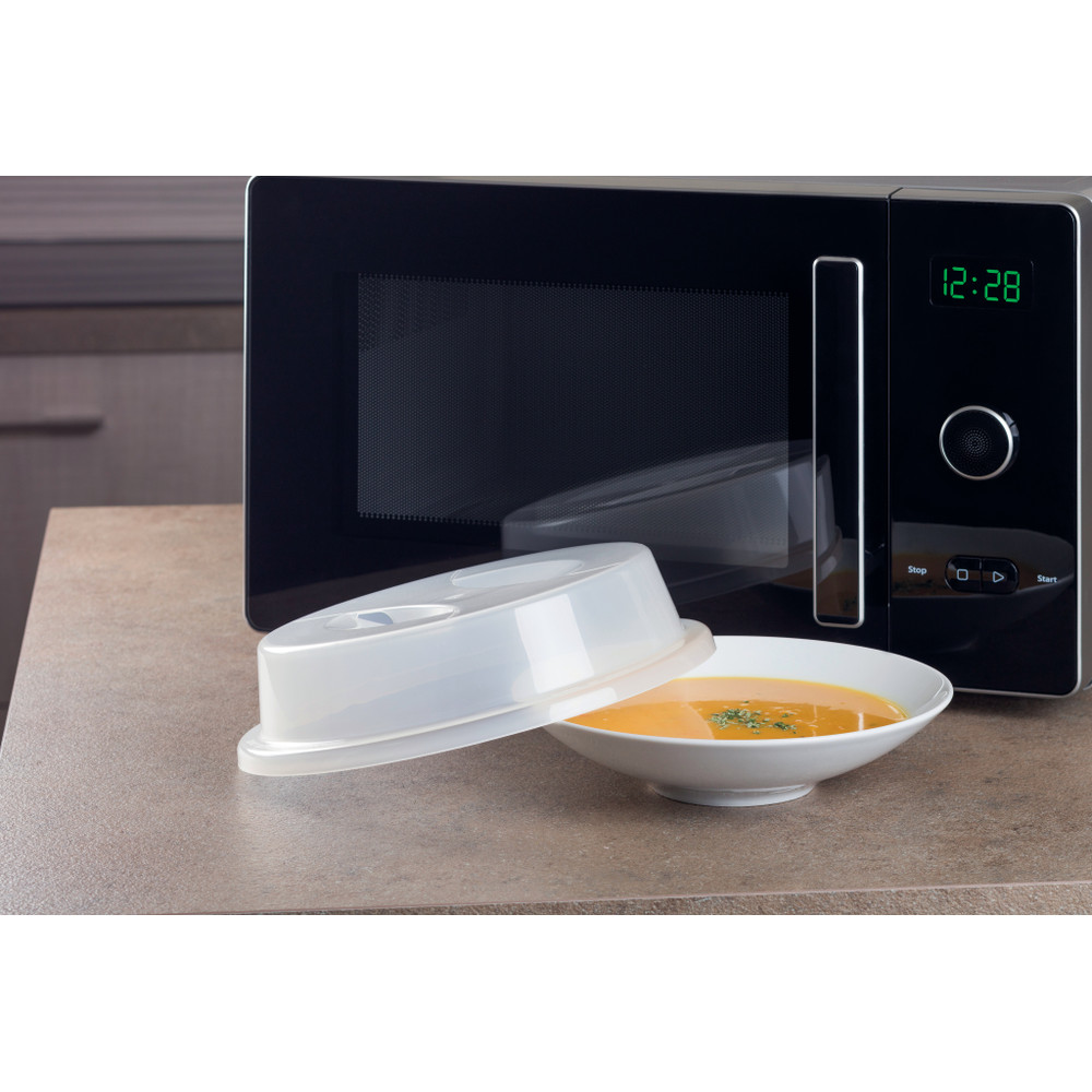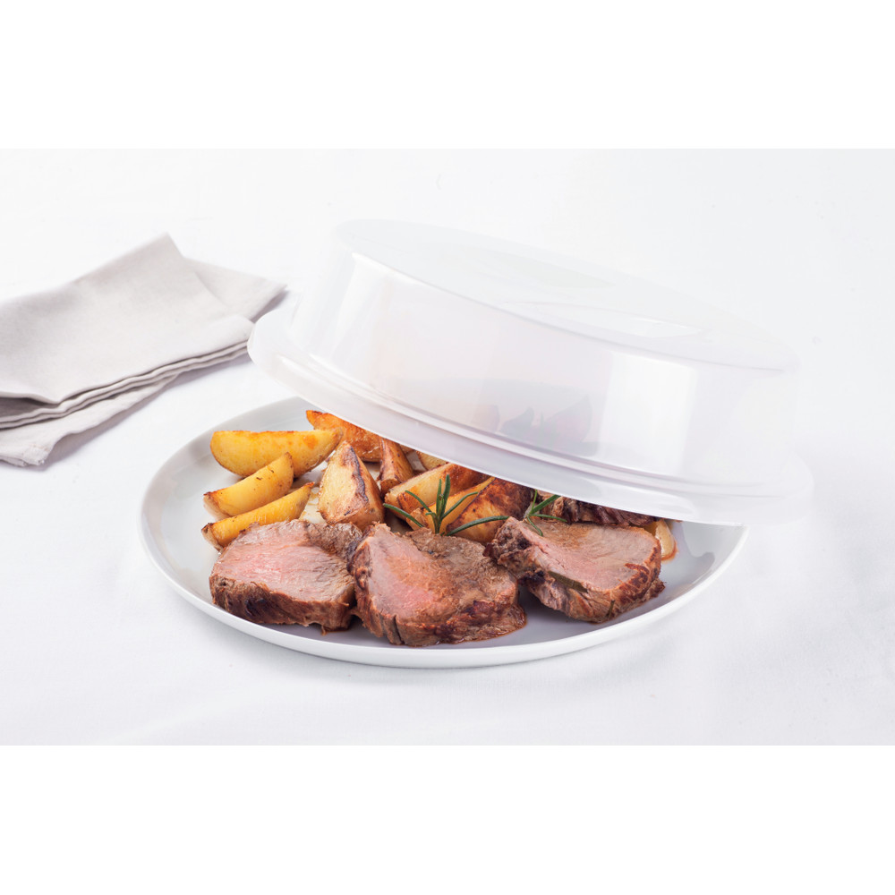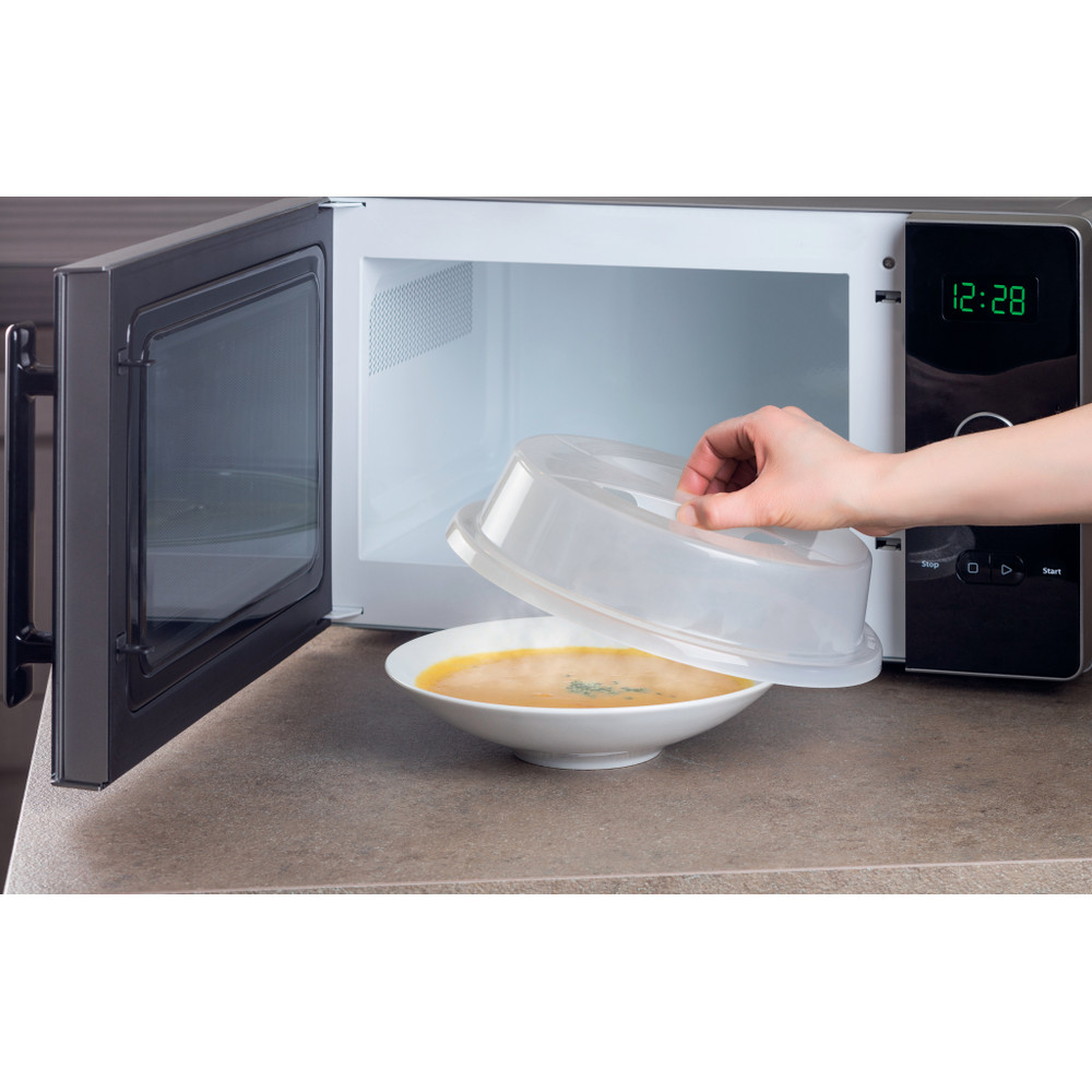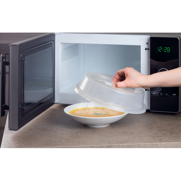 Het Wpro microgolfovendeksel houdt uw microgolfoven schoon tijdens het opwarmen van uw gerechten en voorkomt spatten. Het houdt uw gerechten ook warm. Zijn ergonomische vorm zorgt voor een eenvoudig gebruik en het vrijlaten van stoom. BPA vrij. Afmetingen Ø26.5 cm.
