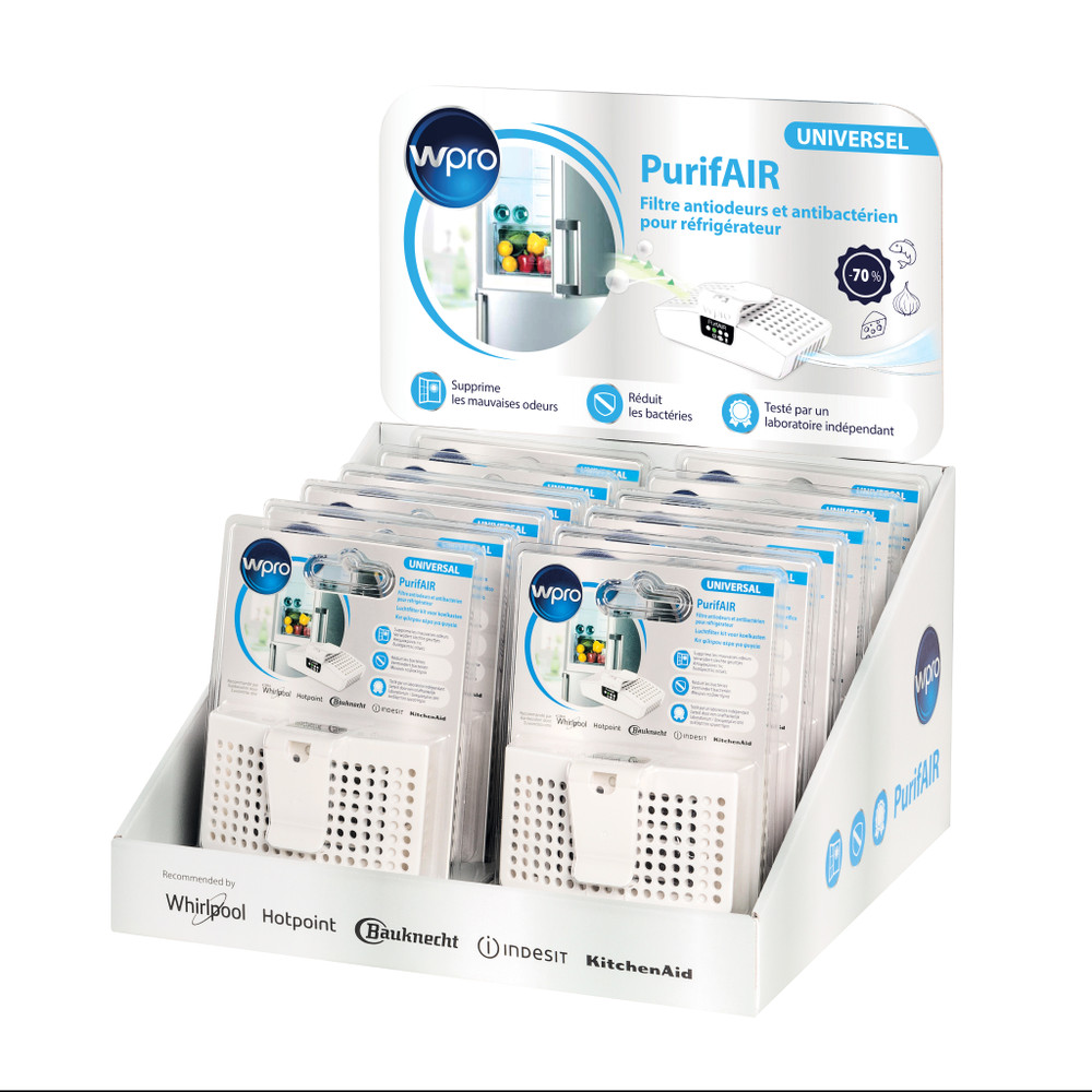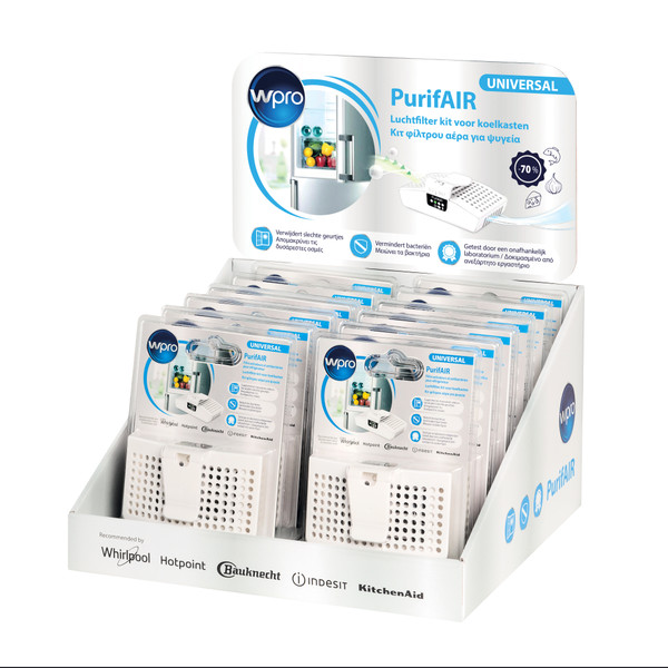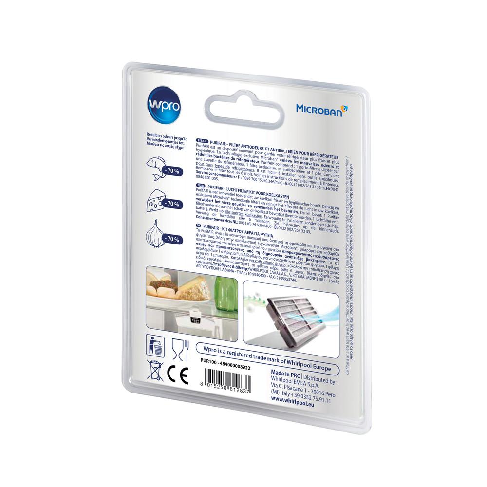 PurifAIR is een innovatief apparaat om uw koelkast frisser en hygiënischer te houden. Dankzij de Microban® exclusieve technologie, filtert en reinigt het effectief de lucht binnen in uw koelkast. Zo worden onaangename geurtjes verwijderd en wordt een bescherming geboden tegen bacteriën. Dankzij zijn absorberende werking vermindert de koolstoffilter gemiddeld 70% van de moleculen die onaangename geurtjes veroorzaken. De actieve koolstoffilter is behandeld met Zinkpyrithione die de hoeveelheid bacteriën vermindert met 60%. Een LED zal aangeven wanneer de filter vervangen moet worden (aanbevolen iedere 6 maanden). De kit bevat: 1 PurifAIR filterhouder welke gemonteerd kan worden op de koelkastplank, 1 luchtfilter en 1 batterij. Geschikt voor elke koelkast, zelfs statische koelkasten.