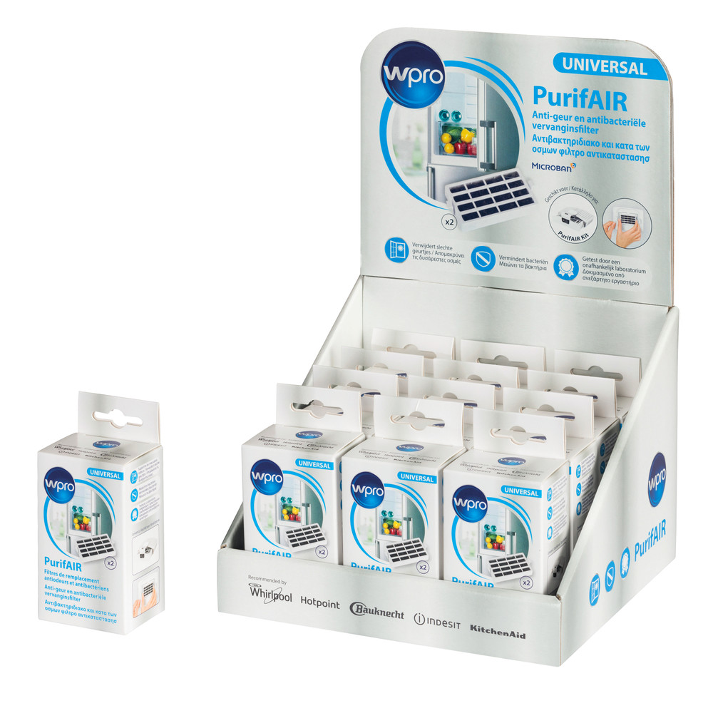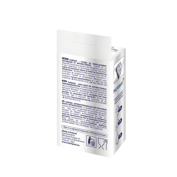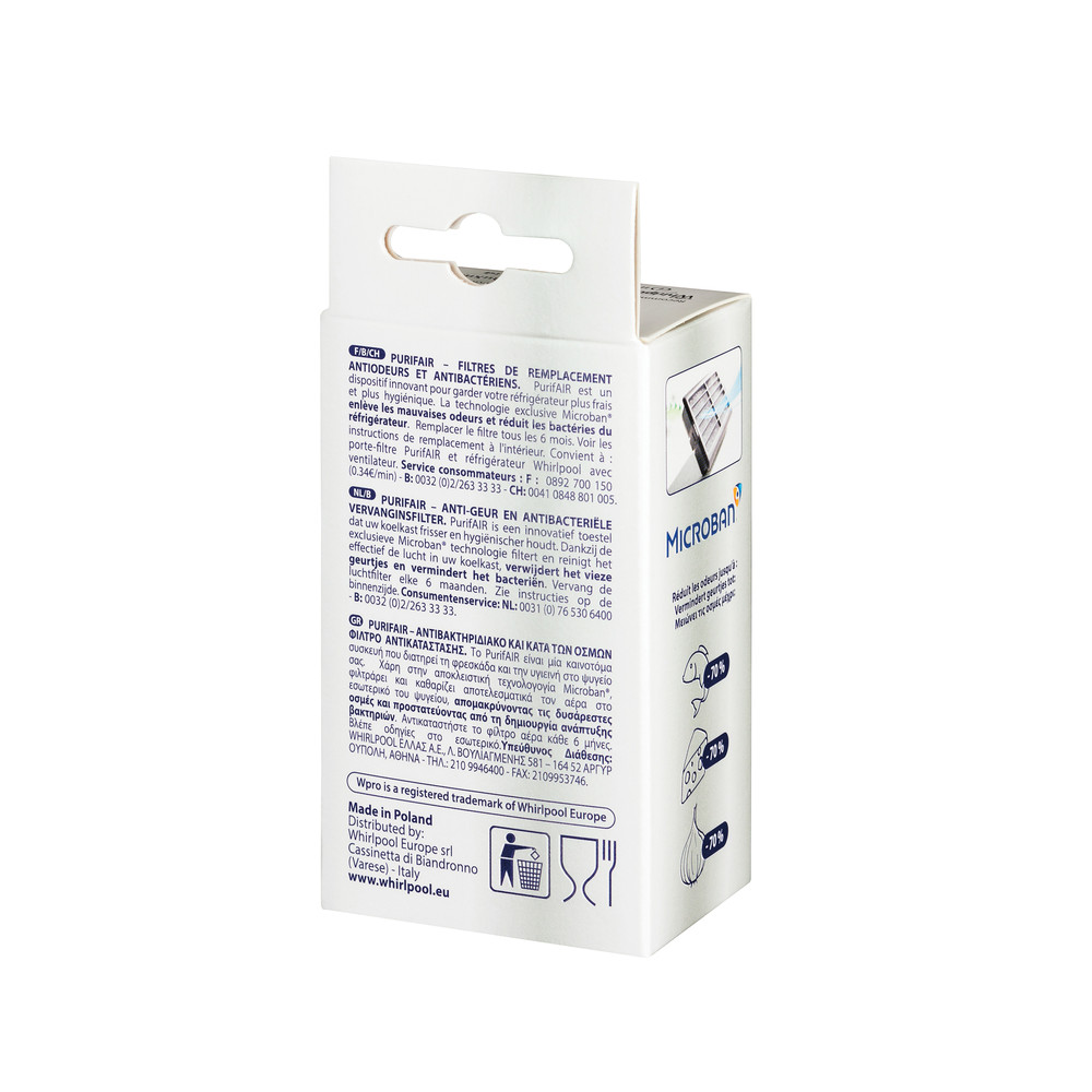 Vervangingskit met 2 antibacteriële Mircroban luchtfilters voor de Purifair houder. Elimineert onaangename geurtjes en houdt de koelkast fris en hygiënisch. De filter dient om de 6 maanden vervangen te worden.